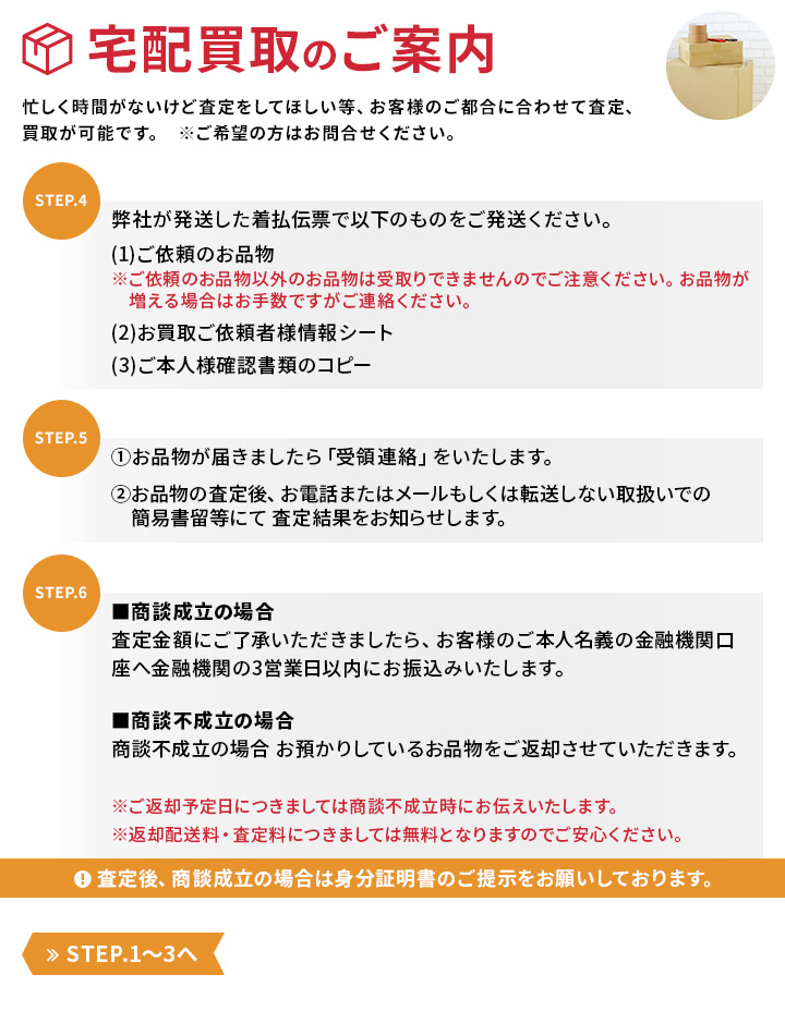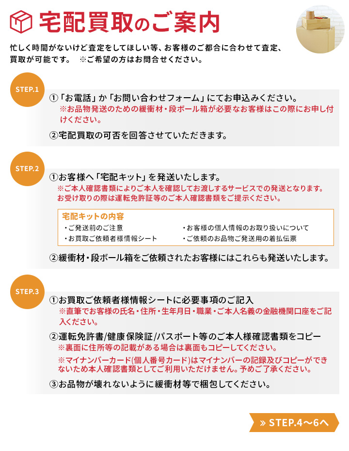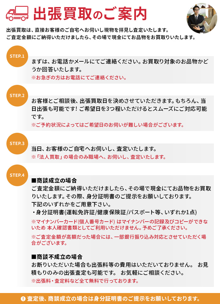 お電話頂ければ、全国無料出張査定にお伺いいたします。提示させて頂いた金額にご納得頂けばその場で現金をお渡し致します。